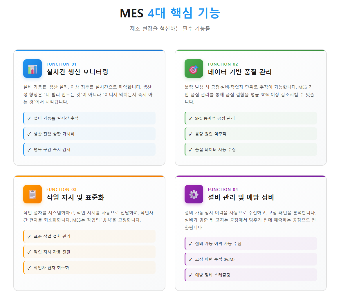 MES 도입의 본질은 자동화 이전에 '보이게 만드는 것' 입니다. 많은 제조 현장이 공통적으로 겪는 문제가 있습니다. 생산이 어디서 지연되는지 알 수 없고, 불량이 왜 발생했는지 추적이 어려우며, 설비 고장이 항상 갑작스럽다는 것 입니다. MES는 실시간 데이터 수집, 대시보드 기반 시각화, 이상 발생 시 즉시 알림을 통해 이런 문제들을 해결합니다. 결과적으로 감(感)이 아닌 데이터로 판단하는 공장이 됩니다.