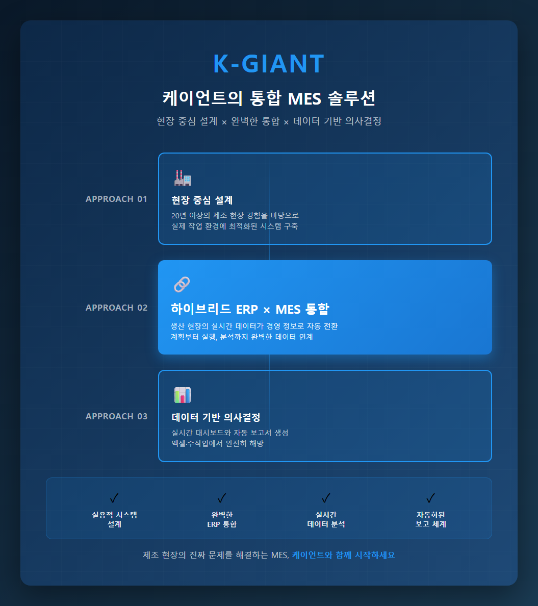 MES 솔루션은 ‘생산을 관리하는 시스템’ 을 넘어 제조 현장을 '이해하게 만드는 시스템' 입니다. 도입 자체보다 중요한 것은 우리 공장의 문제를 얼마나 정확히 파악하고 예측했는가 입니다. 케이언트는 단순한 MES 구축을 넘어, 현장 중심의 실용적인 시스템 설계, ERP와의 완벽한 통합, 데이터 기반 의사결정 체계 구축까지 종합적인 전사적 솔루션을 제공합니다. 제조 현장의 진짜 문제를 해결하는 MES, 케이언트와 함께 시작하세요.