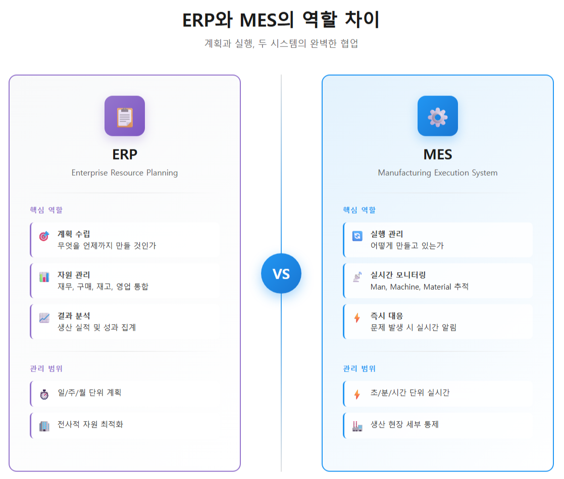 MES에 대한 내용을 알아보았으니 이제 ERP와의 차이점을 알아봅시다. ERP는 '계획과 결과' 를 관리하고, MES는 '실행 과정' 을 관리합니다. ERP에서 "오늘 100개를 생산하라"는 지시를 내리면, MES는 실제 현장에서 몇 개가 생산되고 있는지, 어느 공정에서 지연이 발생하는지를 실시간으로 파악합니다. 계획은 ERP, 현장의 진실은 MES가 담당하는 것이죠. 요약하면, 솔루션의 적용 범위가 다른거죠.